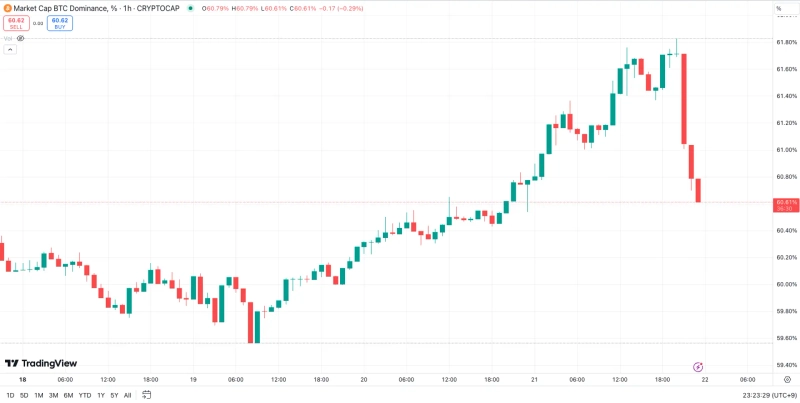 비트코인(BTC) 도미넌스(가상자산 전체의 시가총액 중 비트코인이 차지하는 비중)가 단기 하락세를 보이면서 61%를 반납했다.
