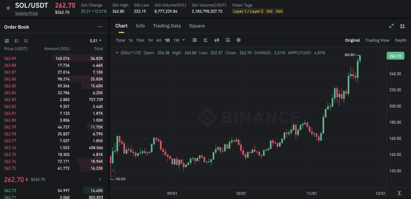 22일(현지시간) 솔라나는 바이낸스 테더(USDT) 마켓에서 전일 대비 12% 급등하며 전고점(260.06달러)를 넘어섰다. 현재 솔라나는 262달러를 상회하고 있다.