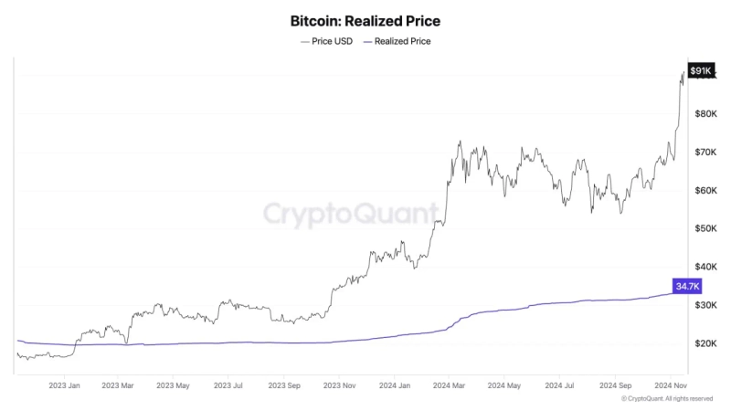 22일 온체인 데이터 분석 플랫폼 크립토퀀트의 분석가 '온새미로'는 "비트코인의 가격이 상승하면서 실현가격 또한 3만4700달러에 이르렀다"면서 이같이 밝혔다. 실현 가격은 실현 시가 총액을 전체 코인 공급량으로 나눈 것이다. 시장 참여자들의 코인 매수 평균가를 나타내며 저항 혹은 지지선으로 해석된다.