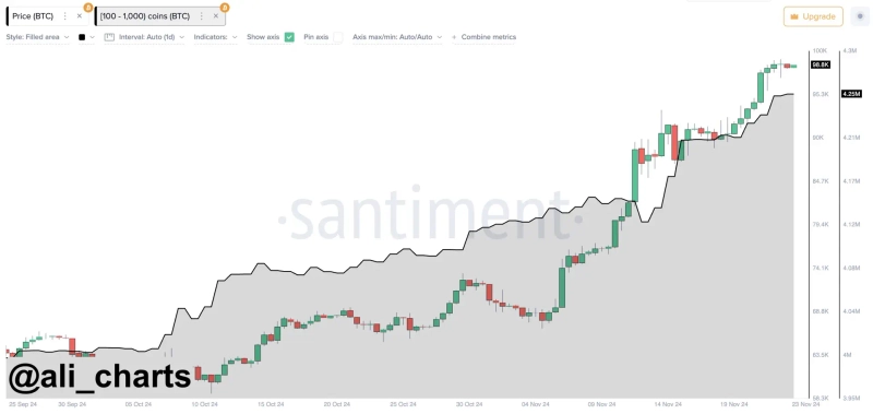 22일(현지시각) 알리 마르티네즈 가상자산 분석가는 X를 통해 "지난 4일 동안 비트코인 고래는 4만 BTC 이상을 매수했다"라며 "이는 39억6000만 달러 규모"라고 밝혔다.