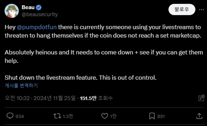 커뮤니티에 알려진 바에 따르면 한 가상자산 라이브 스트리밍에서는 자신이 발행한 밈코인이 특정 시가총액에 도달하지 못한다면 극단적인 선택을 하겠다는 발언도 서슴없이 나온 것으로 전해졌다.