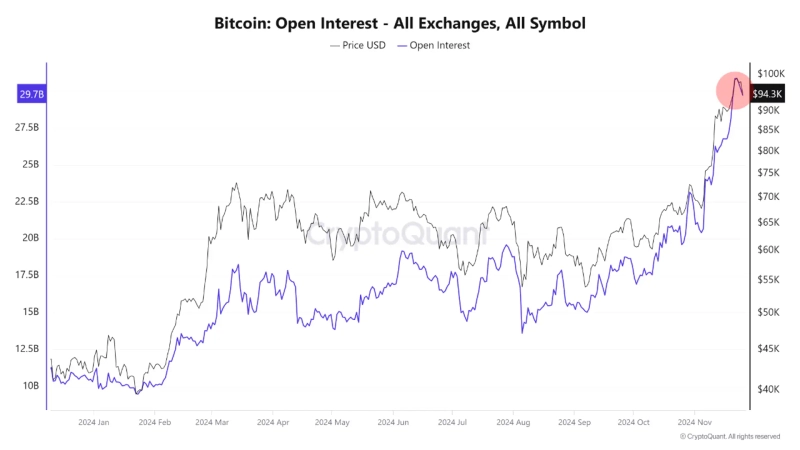 26일 맥디 크립토퀀트 기고자는 보고서를 통해 "비트코인은 10만달러 저항을 돌파하지 못하고 9만2500달러로 조정을 받았다. 이러한 조정이 발생한 이유는 비트코인이 연중 최고가를 경신하는 와중 레버리지 과열 현상이 발생했기 때문이다"라고 분석했다. 이어 그는 "이 정도의 조정은 자연스러운 현상이다"라고 덧붙였다.