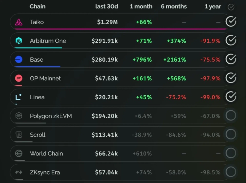 실제 데이터에 따르면 베이스드 롤업 프로젝트 타이코(TAIKO)는 지난 30일 동안 가스 수수료 수익 129만달러를 창출해냈는데, 이는 같은 기간 아비트럼(ARB)에 비해 약 5배 많은 금액이다. 다니엘 왕 타이코 창립자는 "베이스드 롤업은 이더리움 체인에 더 많은 수수료를 지불하여, 이더리움 체인 전체의 보안에 크게 기여하고 있다"고 설명했다.
