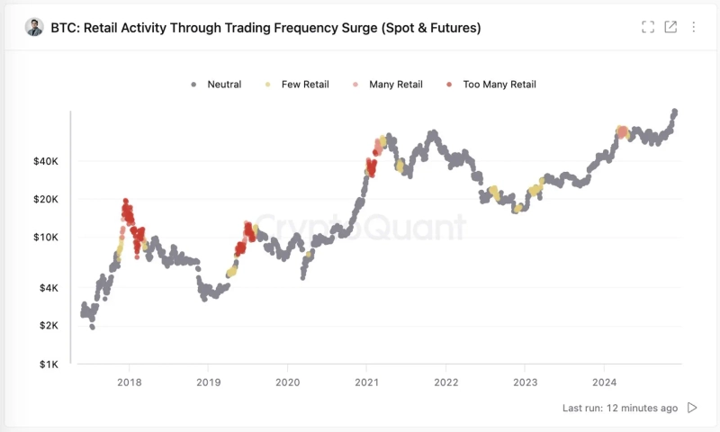 26일 주기영 대표는 X(옛 트위터)를 통해 "비트코인 개인투자자들은 아직 포모가 오지 않았다"라고 말했다. 그가 인용한 크립토퀀트의 '비트코인: 트레이딩 프리퀀시를 통해 분석한 개인투자자 활동' 지표에 따르면 개인 투자자들은 중립적인 투심을 나타내고 있다.