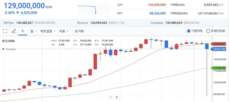 3일 업비트 기준 1억3000만원대에서 거래되던 비트코인은 윤 대통령의 비상 계엄 선포와 급락, 장중 9000만원을 하회했다. 이후 하락분을 다소 회복한 비트코인은 이날 오후 11시 13분 기준 1억2400만원대를 복구했다. 역프리미엄(글로벌 가격보다 한국 가격이 더 저렴한 것)은 순간적으로 -25%를 기록하기도 했다.