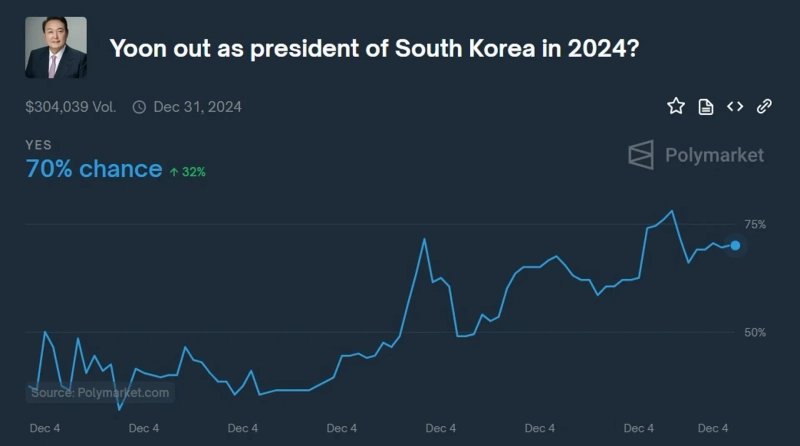 4일 폴리마켓에는 전날 윤 대통령의 비상 계엄령 선포 이후 관련 베팅들이 7개 가량 열렸다. 오전 8시 기준 "윤 대통령이 연내 퇴임할 것인가"라는 질문에는 약 32만 달러의 베팅이 이뤄졌으며, 퇴진 가능성은 64%로 평가됐다.
