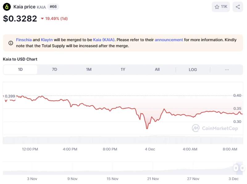 - 특히 카이아는 하루 만에 20.25% 하락해 0.33달러를 기록했다고 밝혔다.