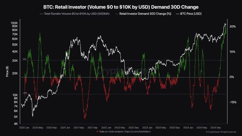 - 비트코인(BTC)의 소액투자자 수요가 급증하고 있다는 분석이 제기되었습니다.