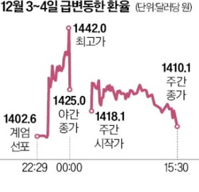 원·달러 환율(오후 3시30분 기준)은 전날보다 7원80전 오른 1410원10전을 기록했다. 계엄령이 선포된 전날 밤에는 1442원까지 치솟았다.