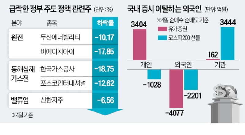 여기에 탄핵 정국이 본격화하면서 정부가 적극적으로 추진하던 주요 국정 과제는 ‘올스톱’될 가능성이 커졌다. 이날 윤 정부의 대표 국정과제 정책 관련주는 일제히 급락했다. 두산에너빌리티(-10.17%) 비에이치아이(-17.85%) 등 원전 관련주, 한국가스공사(-18.75%) 포스코인터내셔널(-12.62%) 등 ‘대왕고래’ 관련주가 주저앉았다. 신한지주(-6.56%) 등 밸류업(기업가치 제고) 관련주도 떨어졌다. 주도주가 사라진 증시에선 정치테마주만 날뛰고 있다. ‘이재명 테마주’로 분류되는 오리엔트정공과 수산아이앤티, 에이텍, 이스타코 등이 이날 상한가를 찍었다.