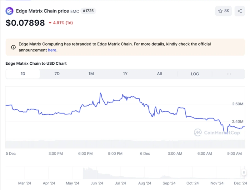 EMC 토큰은 코인마켓캡 기준 6일 오전 10시 현재 전일 대비 4.91% 하락한 0.079달러에 거래되고 있다. 현재 유통되고 있는 EMC 토큰은 약 3000만개로 총 공급량(약 10억개)의 3%를 차지한다. 시가총액은 237만달러 수준이다.