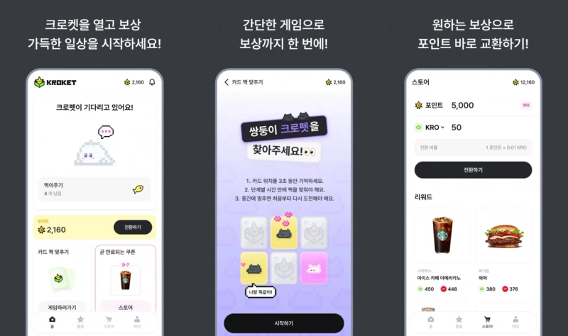 크로켓은 기존 웹2와 웹3를 연결하는 혁신 리워드 앱으로, 사용자들이 다양한 퀘스트, 게임 등을 통해 포인트를 적립하고 이를 모바일 상품권, 가상자산(암호화폐) 등으로 교환하는 플랫폼이다. 기존 리워드 앱의 친숙한 경험(UX)과 웹3 기술을 통합해 누구나 자연스럽게 블록체인 기반 서비스를 사용할 수 있도록 구축됐다.