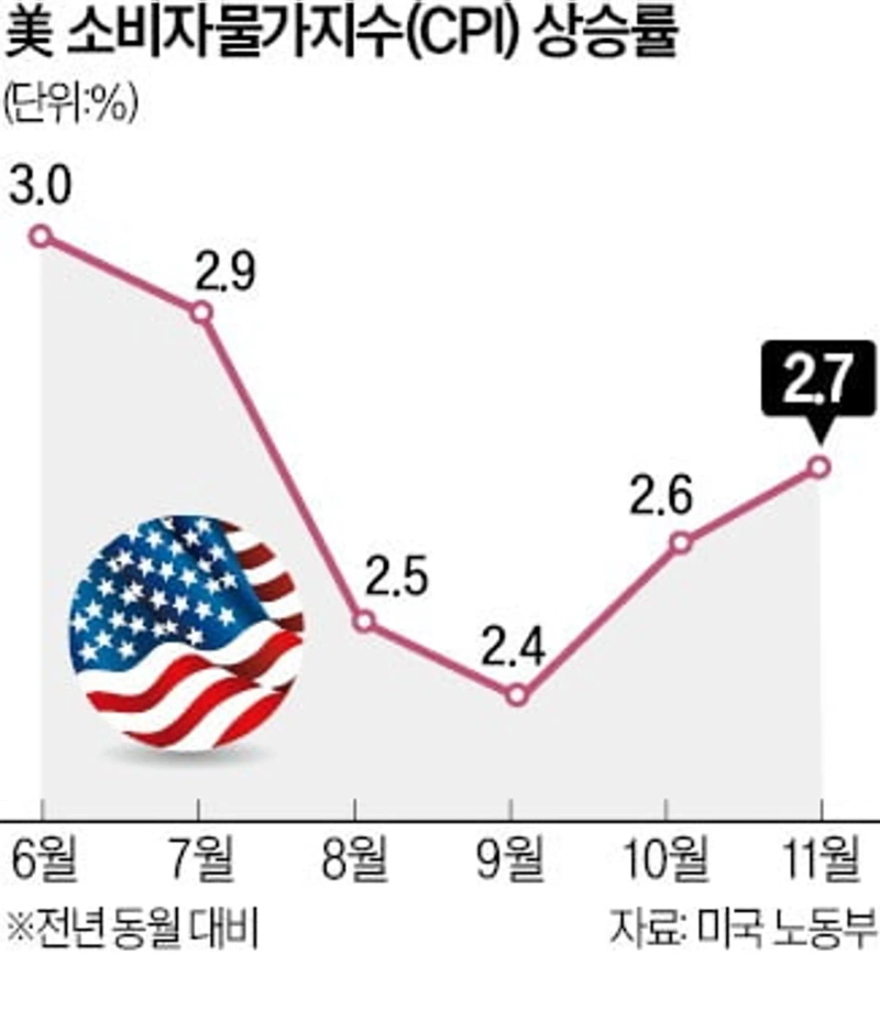 미국 노동부는 지난 11월 소비자물가지수(CPI)가 전년 동월 대비 2.7%, 전월 대비로는 0.3% 올랐다고 11일 발표했다. 이는 다우존스가 집계한 전문가 추정치(2.7%)와 같은 수준이다. 변동성이 큰 식품·에너지를 제외한 근원 CPI는 1년 전보다 3.3% 상승했고 추정치를 벗어나지 않았다. 에너지 가격은 전월보다는 0.2% 상승했으나 작년 같은 달보다는 3.2% 내렸다. 식품 가격은 전달보다 0.4% 올랐고 작년 같은 달보다는 2.4% 상승한 것으로 집계됐다.