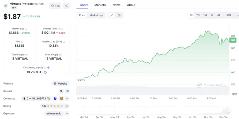 화제성을 증명하듯 버추얼 프로토콜은 급성장했다. 토큰 공개(TGE) 당시 0.05달러에 불과했던 VIRTUAL은 약 10달만에 3000% 폭등하여 현재는 1.87달러를 기록 중이다. 시가총액은 18억7000만달러로, 전체 가상자산 가운데 67번째로 높다.