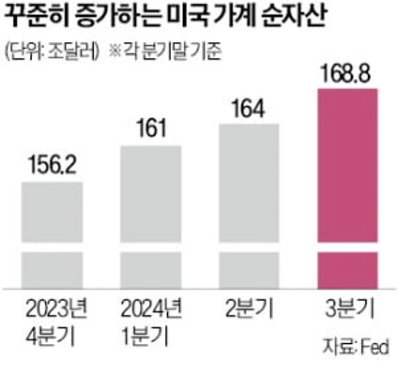 전 분기 대비 자산 증가분 중 주식 보유 가치가 3조8000억달러 늘었다. 이는 순자산 증가분의 80%에 달하는 규모다. 지난 9월 Fed가 빅컷(기준금리 0.5%포인트 인하)을 단행하고, 트럼프 당선인의 백악관 복귀 가능성이 부각되며 기업 친화적 정책을 펼칠 것이라는 기대감 등이 증시 랠리를 이끌었다는 분석이 나온다. 3분기 S&P500지수는 잇달아 최고치를 경신하면서 5.5% 상승했다. 기술주 랠리에 힘입어 나스닥지수도 2.4% 올랐다.
