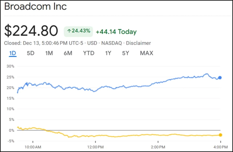 브로드컴의 주가는 뉴욕 증시 출발과 함께 20% 넘게 뛰었습니다. 전날 장 마감 뒤 내놓은 4분기 매출은 지난해 같은 기간보다 51% 증가했고, 순이익은 23% 늘었습니다. 이는 월가 추정과 엇비슷했습니다. 그런데 AI 관련 매출은 220%나 증가했습니다. 실적보다는 혹 탄 CEO의 향후 AI 시장 전망이 월가 주가에 로켓을 달아줬습니다. 탄 CEO는 "대형 하이퍼스케일러 3곳(구글, 메타, 바이트댄스)과 AI 칩을 개발 중이다. 이들 각각의 업체는 2027년까지 (브로드컴과 함께 만든) 100만 개의 맞춤형 AI 칩을 데이터센터에 쓸 것으로 예상한다"라고 밝힌 것입니다. 그는 "향후 3년 동안 AI에서 기회를 본다"라며 이게 2027회계연도까지 600~900억 달러 매출 기회를 줄 것이라고 설명했습니다. 또 그보다 작은 또 다른 하이퍼스케일러 2곳(오픈AI와 애플)와 비슷한 계약을 체결했다고 확인했습니다.
