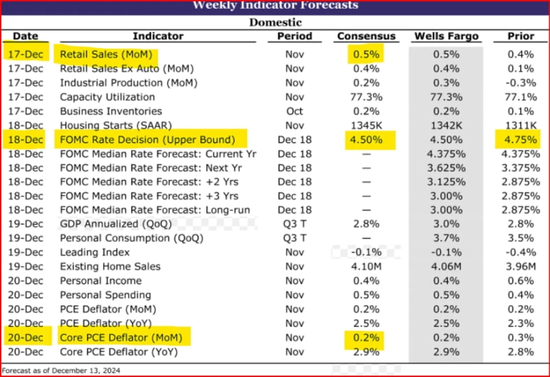 다음주에는 17일 11월 소매판매와 산업생산이 발표되고요. 20일에는 11월 개인소비지출(PCE) 물가가 나옵니다. 소매판매는 이미 발표된 강력한 자동차 판매량을 기반으로 0.5% 안팎 상승할 것으로 예상되고 있습니다. PCE 물가의 경우 에너지와 식품을 제외한 근원 PCE 가격이 전달보다 0.2% 오를 것으로 전망되고 있습니다. 사실 PCE 물가는 원래 매우 중요한 지표인데요. 이번 주에는 17~18일 열리는 FOMC 이후에 나오기 때문에 김이 좀 빠집니다.