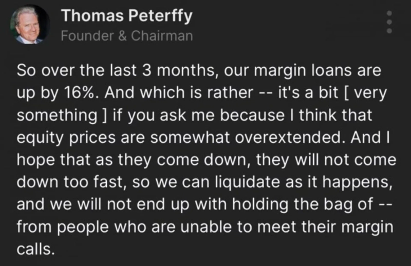 최근 시장 과열이 우려된다는 걱정도 나왔습니다. 인터랙티브브로커스의 토마스 피터피 설립자는 X에 "지난 3개월 동안 우리의 마진 대출이 16% 증가했다. 솔직히 말해, 주가가 약간 과도하게 상승했다고 생각하기 때문에, 이런 상황은 약간 매우 우려스러운 상황이라고 본다. 주가가 하락할 때 너무 급격히 떨어지지 않기를 바란다. 우리가 상황에 따라 청산하게 되어 마진콜에 응하지 못하는 사람들의 손실을 떠안게 되는 일이 없기를 바란다"라고 밝힌 것입니다. 그의 메시지가 월가에 회자되자, 피터피 설립자는 메시지를 지웠습니다. 그래도 캡처된 이미지가 계속 돌아다니며 시장 분위기를 짓눌렀습니다. 그는 최근 블룸버그 인터뷰에서 "시장이 너무 확대됐을지 걱정된다. 하락 전환은 매우 큰 위험이다. 마진 밸런스(마진 빚)가 급격히 증가하기 때문이다. 나는 모두가 이런 상황을 주시하고 예방적인 조치를 하기를 바란다"라고 말하기도 했습니다.