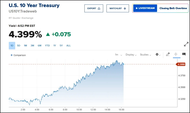 시장을 누른 또 다른 요인은 매일 이어지는 국채 금리의 상승이었습니다. 뉴욕 채권시장에서 10년물 수익률은 오후 4시 20분께 7.5bp 뛴 4.399%를 기록했습니다. 장중 4.407%까지 오르기도 했는데요. 이번 주 5일 연속 상승했고요. 오름폭은 25bp에 달합니다.