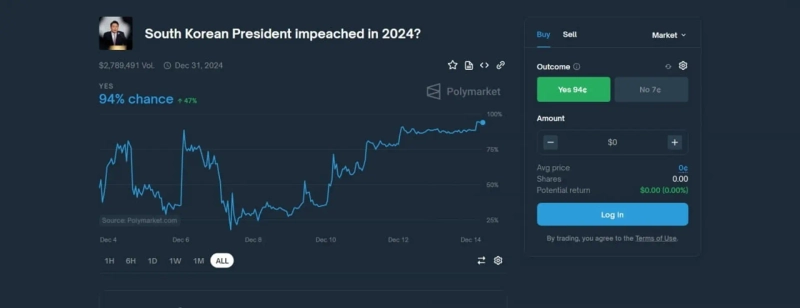 - 윤석열 대통령의 탄핵 가능성이 암호화폐 기반 베팅 사이트에서 95%로 집계되었다고 밝혔다.