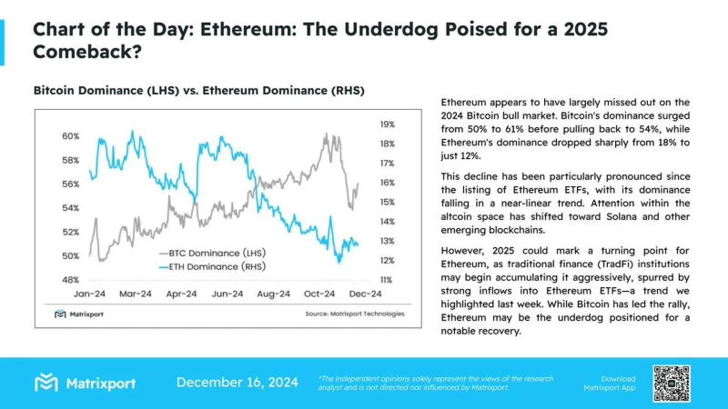 - 이더리움의 도미넌스는 급격히 감소했지만 내년 모멘텀 회복 가능성이 있다고 부연했다.