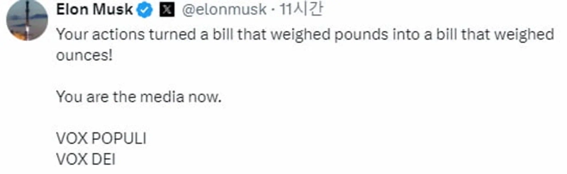 머스크 등은 최종안에서 부채한도 폐지 내용이 포함되지 않았지만 원하는 것을 얻어냈다며 '승리'라고 자평하고 있다. 머스크는 통과 소식이 나오자 "민중의 목소리가 신의 목소리(VOX POPULI / VOX DEI)"라고 적었다.