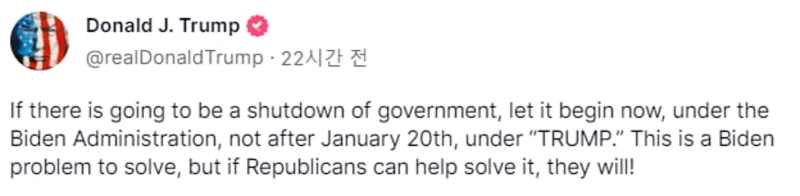 미국 의회에서 셧다운 직전까지 예산이 통과되지 않는 상황은 종종 있었지만, 이번에는 트럼프 당선인과 일론 머스크 테슬라 최고경영자(CEO)가 양당의 합의 내용을 뒤집어야 한다고 요구하면서 상황이 복잡해졌다. 트럼프 당선인은 트루스소셜에 "셧다운을 해야 한다면 내년 1월20일 취임식 이후가 아니라 바이든 정부에서 해야 한다"면서 "터무니없는(ridiculous) 부채한도를 폐지하든지 2029년까지 연장해야 한다"고 주장했다.