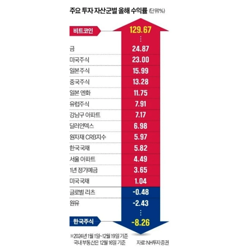 지난 수십 년간 재테크 시장에서 통용되던 전통적 논리가 무너진 한 해였다. 안전자산인 금과 위험자산인 비트코인, 미국 주식이 동반 랠리를 펼치고 달러 가치가 고공행진을 이어가는 등 '에브리싱 랠리'가 펼쳐졌다. 하지만 한국 주식은 오히려 투자자에게 8% 넘는 손해를 안겼다.