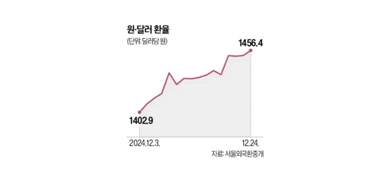 원·달러 환율이 24일 연고점을 재차 경신했다. 국내 정치적 불확실성이 지속되는 가운데 달러 강세가 나타나면서 환율이 상승한 것으로 분석됐다. 한국은행은 이날 금융안정보고서를 통해 "금리 인하기 환율 상승과 변동성 확대로 인한 대외 리스크에 유의해야 한다"고 밝혔다.