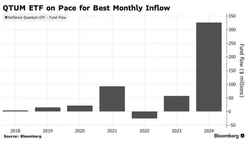 24일(현지시간) 블룸버그 통신에 따르면 양자컴퓨팅 관련주를 담은 '디파이언스 퀀텀 ETF'(QTUM)에는 12월에만 2억5000만달러가 유입되며 2018년 상장 이후 가장 많은 월간 현금 유입액을 기록했다. 이달 들어서 24일까지 17.2% 급등했다.