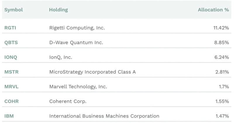 QTUM은 양자컴퓨팅과 관련된 72개 종목을 들고 있다. 양자 집적회로 개발 기업 리게티컴퓨팅(비중 11.42%), 세계 최초로 양자 컴퓨터를 상용화한 캐나다 기업 디웨이브퀀텀(8.85%), 양자컴퓨팅 스타트업 아이온큐(6.24%) 등이 비중 상위 종목이다. 알파벳과 엔비디아도 각각 1.2%의 비중을 차지한다.