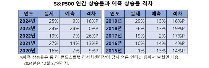 마지막으로, 리 센터장이 지난 10년간 냈던 증시 예측이 얼마나 맞았는지를 살펴봤습니다. 아래 표에 그 내용을 정리했습니다. 그의 예측과 실제 상승률 간의 격차가 10%포인트 이상 났던 게 10차례 중 7차례였습니다. 하지만 그에게는 아무 잘못이 없습니다. 증시는 원래 그런 것이니까요.