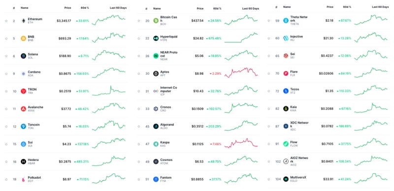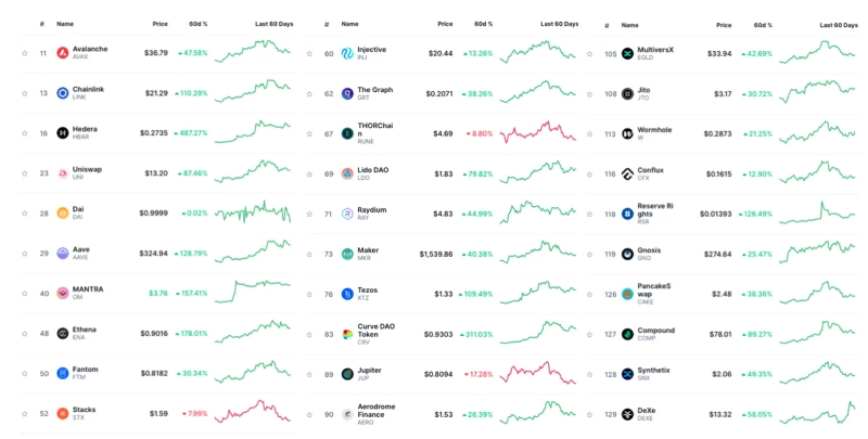 가상자산 데이터 분석 기업 카이코는 최근 보고서를 통해 "주요 레이어1 프로젝트 코인 상위 10개는 미 대선 이후로 평균 120% 넘게 오르며 비트코인과 이더리움을 능가하며 최고의 성과를 거뒀다"고 밝혔다. 실제로 미 대선 이후로 카르다노(ADA)는 156% 올랐고, 수이(SUI)는 137%, 헤데라(HBAR)는 485%, 알고랜드(ALGO)는 203% 올랐다. 국산 레이어1 코인 카이아(KAIA)도 67% 올랐다.