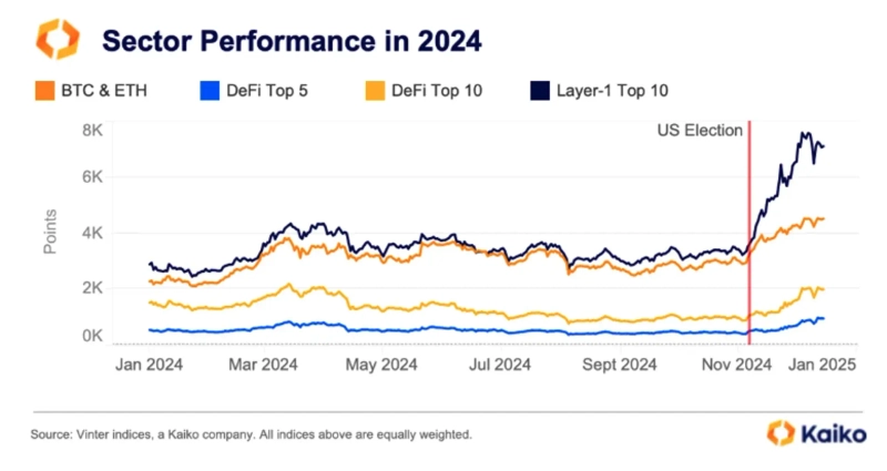 올해 미 대선 이후 가장 성과가 좋았던 암호화폐 부문은 주요 레이어1 프로젝트로 나타났다. 레이어1 블록체인이란 자체 네트워크를 보유해 빠른 거래를 지원하고 수수료가 상대적으로 저렴하다는 특징이 있다. 투자자들은 이밖에도 디파이(탈중앙화 금융), 밈 코인, 인공지능(AI) 관련 코인 등에 집중했다.