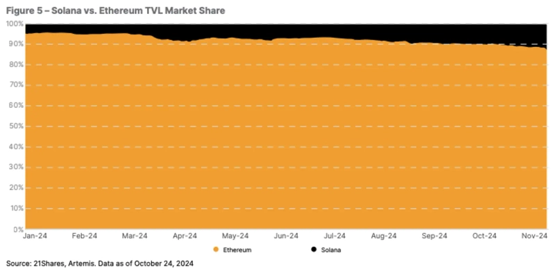 자체 블록체인 네트워크를 보유한 주요 '레이어1 암호화폐'는 더욱 강세를 보일 것이란 분석도 나온다. 글로벌 자산운용사 21셰어즈는 연구 보고서를 통해 "처리 속도가 빠르고 수수료가 저렴해 이더리움의 대체자로 분류되는 수이(SUI), 톤(TON), 솔라나(SOL)는 내년에도 신규 사용자를 계속 끌어들일 가능성이 높다"면서 "특히 솔라나는 이더리움의 시장 점유율을 계속 잠식하게 될 것"이라고 전했다. 보고서는 올 들어 20억달러(약 2조9520억원)가 넘는 자금이 이더리움에서 솔라나로 이동했다고 분석했다.