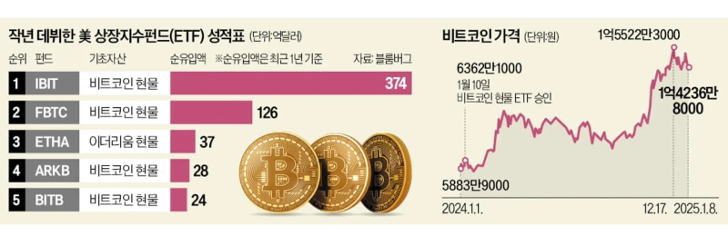 9일 한국경제신문이 블룸버그를 통해 분석한 결과 지난해 미국 증시에 상장한 716개 ETF 가운데 최근 1년간 순유입액이 가장 많은 상품은 '아이셰어즈 비트코인 트러스트 ETF'(티커명 IBIT)였다. 이 상품은 세계 최대 자산운용사 블랙록이 선보인 비트코인 현물 ETF다. 작년 1월 11일 출시 이후 이달 7일까지 374억달러(약 55조원)가 투자금으로 들어왔다.
