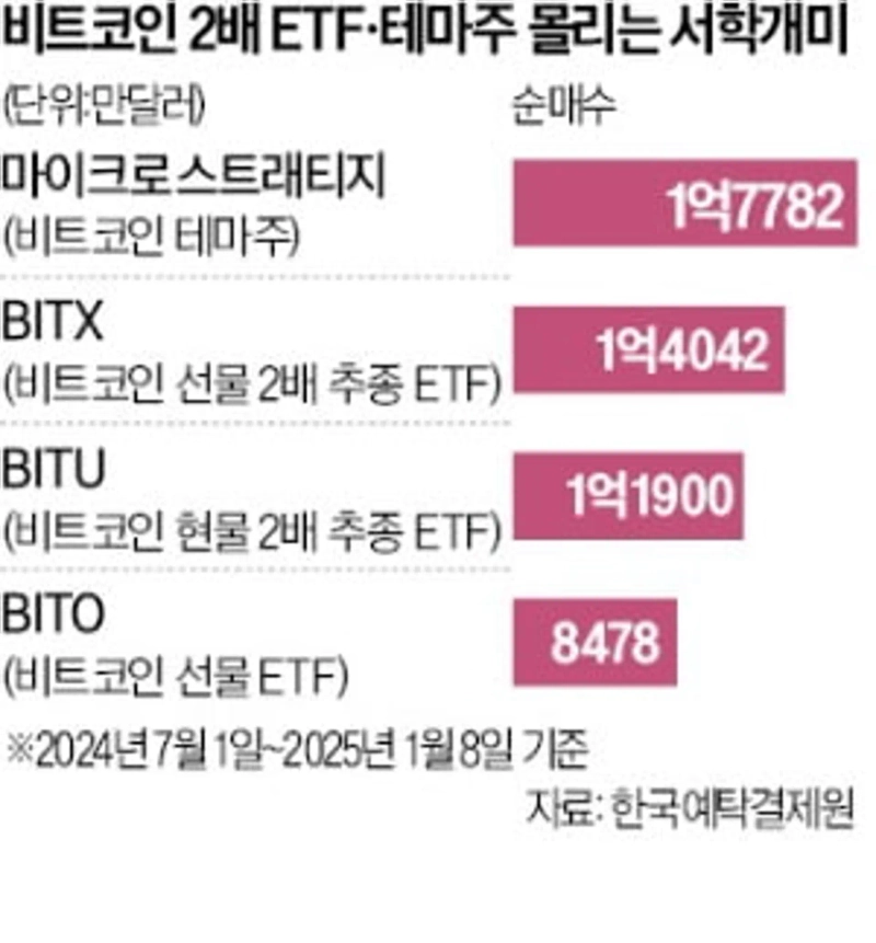 - 마이크로스트래티지와 '2X 비트코인 스트래티지 ETF'(BITX) 등에서 국내 투자자가 대규모 순매수를 기록했다고 밝혔다.