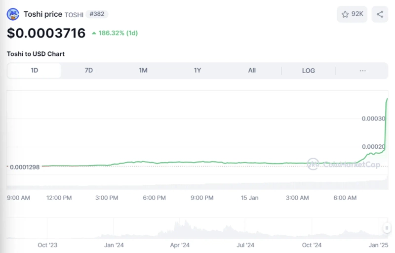이날 오전 8시 45분 현재 토시는 전일대비 186.32% 폭등한 0.0003716달러를 기록하고 있다.