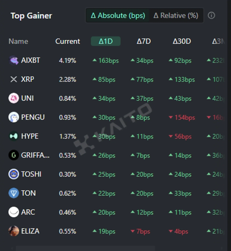 인공지능(AI) 기반 웹3 서치 플랫폼 카이토(Kaito)의 토큰 마인드셰어(Token Mindshare·가상자산 시장 내 특정 토큰의 영향력을 정량화한 지표) 탑게이너에 따르면 15일 현재 사람들이 가장 많은 관심을 보이고 있는 가상자산(암호화폐) 상위 5개는 AIXBT, 리플, 유니스왑(UNI), 퍼지펭귄(PENGU), 하이퍼리퀴드(HYPE) 등이다.