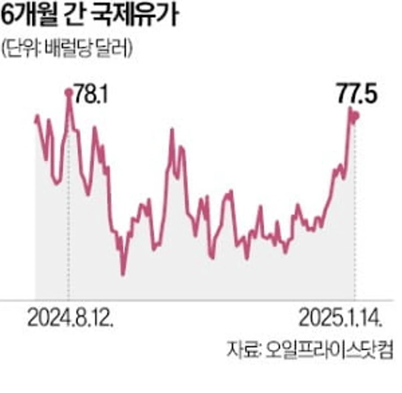 연초 고개 든 국제 유가…WTI 선물, 배럴당 80弗 육박14일(현지시간) 미국 뉴욕상업거래소(NYMEX)에서 서부텍사스원유(WTI) 선물(2월물) 가격은 전장 대비 1.32달러(1.67%) 떨어진 배럴당 77.5달러에 거래를 마쳤다. 북해 브렌트유 선물(3월물)은 전장보다 1.09달러(1.35%) 내려간 배럴당 79.92달러에 마감했다. 전날 국제 유가가 급격히 치솟은 데 따른 기저효과로 풀이된다.