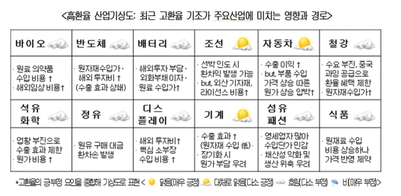- 반도체 및 배터리산업은 고환율로 인한 비용 상승이 매출 증가 효과를 상쇄할 것으로 분석된다고 밝혔다.