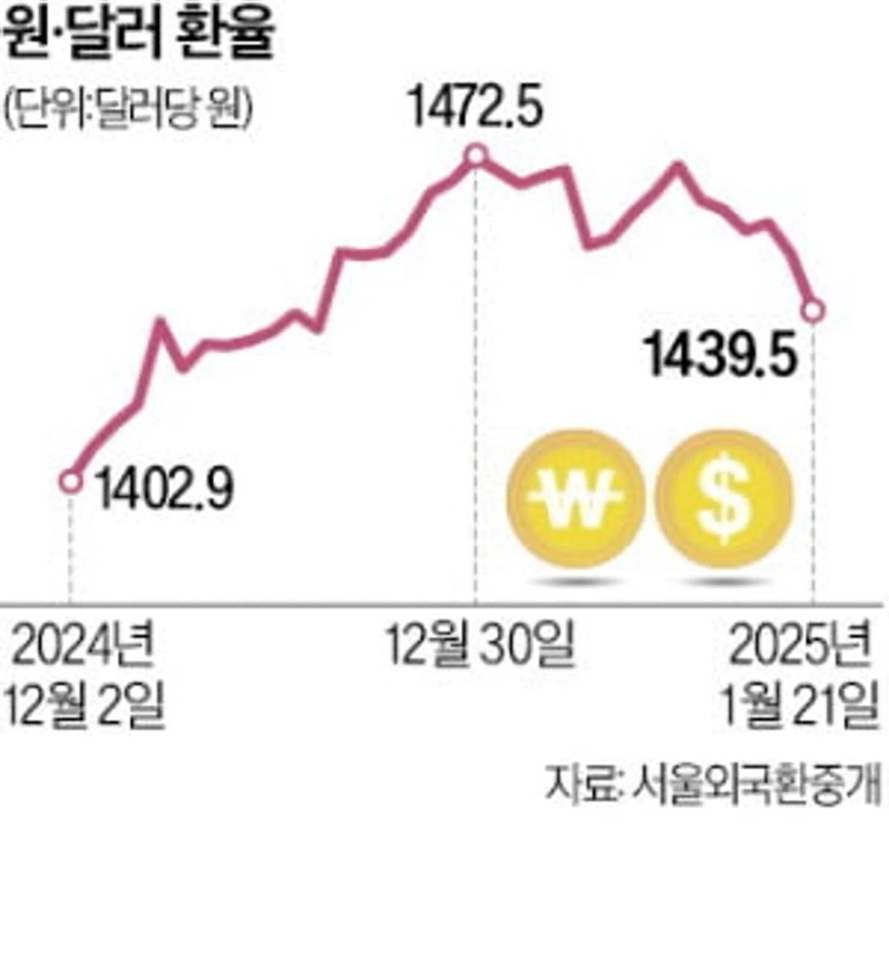 원·달러 환율이 한 달 만에 1430원대로 하락(원화 가치 상승)했다. 도널드 트럼프 미국 대통령이 취임 첫날 관세를 부과하지 않으면서 달러가 약세 흐름을 보였다.