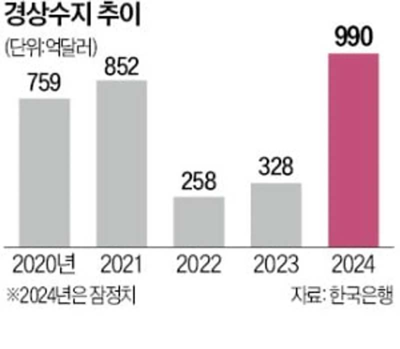 - 한국 경상수지가 990억4000만달러로 9년 만에 최대 흑자를 기록했다고 밝혔다.