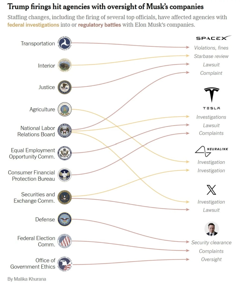 정부 규모를 줄이는 과정에서 쫓겨난 관료 중에는 머스크의 기업을 대상으로 조사, 법 집행, 소송 등을 진행하고 있던 인사들이 포함돼있다는 것이다. NYT에 따르면 스페이스X, 테슬라 등 머스크의 6개 회사에 대해 32건 이상의 조사를 진행하고 있던 최소 11곳의 연방 기관이 트럼프 행정부의 정부 개편 영향을 받는 것으로 나타났다.