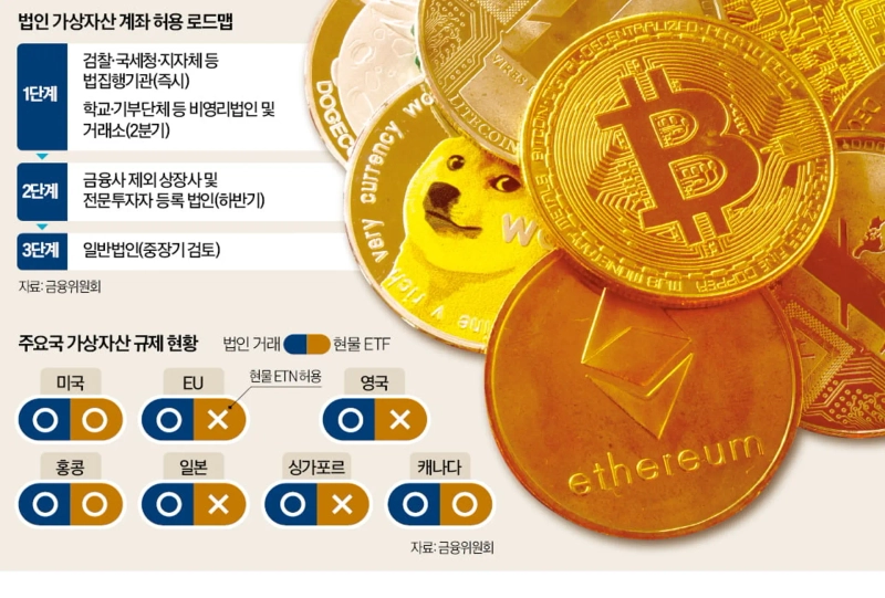 이르면 하반기부터 유가증권·코스닥시장 상장법인 약 2500곳과 자본시장법상 전문투자자로 등록한 법인 약 1000곳 등 총 3500여 개사도 법인 계좌를 개설해 가상자산 소유와 매매를 할 수 있다. 금융당국은 상반기 안에 투자할 수 있는 가상자산 종류와 거래량 등을 제한하는 내용의 가이드라인을 마련해 하반기부터 시범적으로 허용하겠다는 방침이다. 다만 금융회사는 허용 대상에서 제외해 비트코인 현물 상장지수펀드(ETF) 국내 도입은 미뤄질 전망이다.