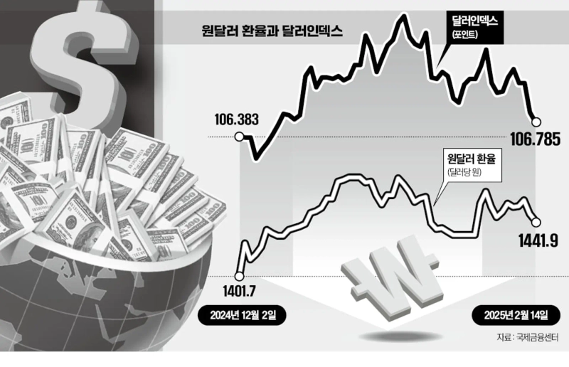 문제는 달러 가치가 하락한 만큼 원·달러 환율은 충분히 떨어지지 않고 있다는 점이다. 국제금융센터에 따르면 주요 6개국 통화 대비 달러화 가치인 달러화지수는 지난 14일 106.785포인트였다. 한국의 비상계엄 선포 직전인 지난해 12월 2일 106.383과 비슷한 수준까지 내려왔다. 이에 따라 원·달러 환율도 다소 안정됐다. 작년 12월 30일 1472원50전까지 올랐던 환율이 최근 1440원대로 30원 넘게 떨어졌다. 하지만 비상계엄 직전인 12월 2일 1401원70전에 비해서는 여전히 40원 정도 높다. 달러화지수 상승(0.38%)을 고려하더라도 1406원 부근에 있어야 하지만 35원 이상 높은 셈이다.