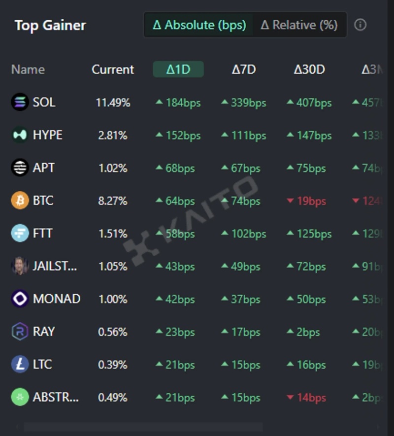인공지능(AI)기반 웹3 서치 플랫폼 카이토(Kaito)의 토큰 마인드셰어(Token Mindshare, 가상자산 시장 내 특정 토큰의 영향력을 정량화한 지표) 탑게이너에 따르면 19일 현재 사람들이 가장 많이 관심을 보이고 있는 가상자산(암호화폐) 관련 키워드 상위 5개는 솔라나(SOL), 하이퍼리퀴드(HYPE), 앱토스(APT), 비트코인, FTT 등이다.