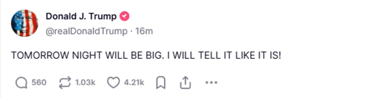 이와 관련해 트럼프 대통령은 트루스소셜을 통해 "내일 밤은 대단한 순간이 될 것"이라며 "있는 그대로 말하겠다"라고 전했다.