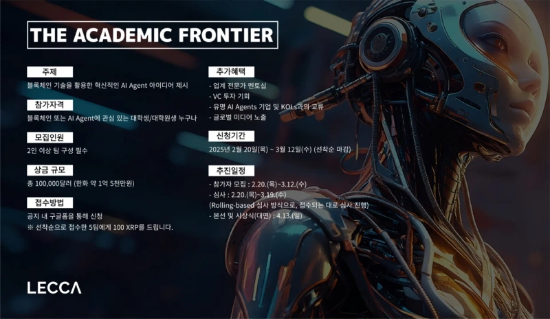 이번 행사는 AI 에이전트와 블록체인 기술을 결합한 혁신 아이디어를 발굴하기 위한 경진대회 아카데믹 프론티어(The Academic Frontier)로, 오는 4월 13일 서울에서 개최된다.