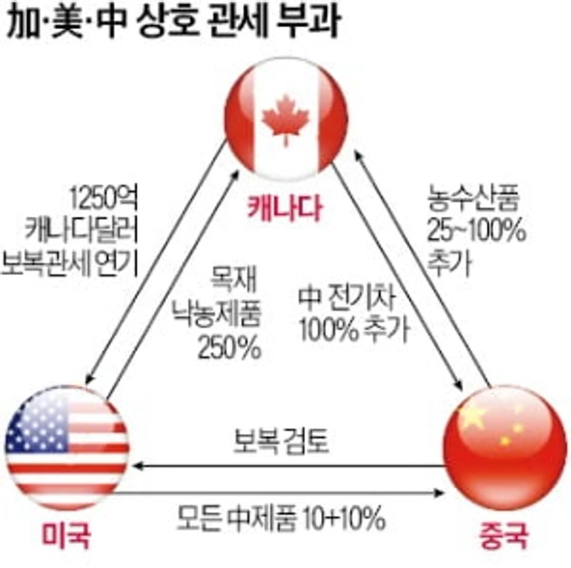 미국과 중국이 캐나다에 잇달아 관세 폭탄을 날렸다. 도널드 트럼프 미국 대통령은 캐나다산 제품에 관세 부과를 유예하겠다고 발표한 지 하루 만에 목재·낙농 제품에 250% 관세를 물리겠다고 예고했다. 이어 중국도 캐나다산 일부 농축산품 및 수산물에 25~100% 추가 관세 부과를 예고했다. 무역 갈등을 빚고 있는 미·중 사이에서 관세 전쟁을 벌이는 처지가 됐다.